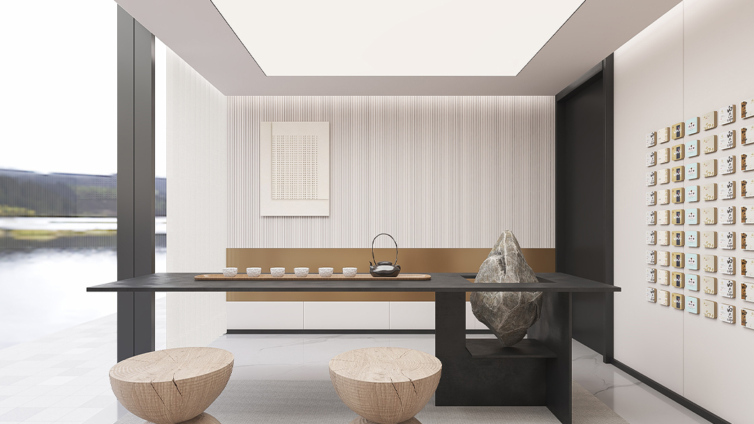 采用无主灯设计结合智能调光系统,通过磁吸轨道灯与隐藏式灯带营造多场景氛围;开放式茶台区以线性照明强化操作台面实用性,私密包厢则利用夹绢玻璃移门实现光线柔和过渡,兼顾社交互动与静谧独处需求。 - 细节处的文化隐喻
