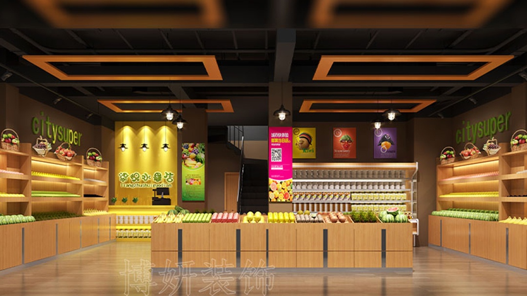 杭州连锁水果超市装修设计,走进店内,裸顶喷黑的处理打破常规,营造出工业风与时尚感交织的独特氛围,让空间更具纵深感与神秘气息。橙黄色作为点缀色惊艳亮相,从招牌到店内的装饰线条,灵动的橙黄如跳跃的音符,瞬间抓住顾客目光,传递出水果的鲜活与热情,激发人们的购买欲望。原木展示货架,是店内一大亮点,天然的木纹质感,给人质朴、温暖的感受。其合理的分区设计,让各类水果有序陈列,方便顾客挑选。橙黄与原木、黑顶相互映衬,既有时尚的冲击力,又不失自然的亲和力。在这里,顾客能尽情享受一场视觉与味觉的双重盛宴。