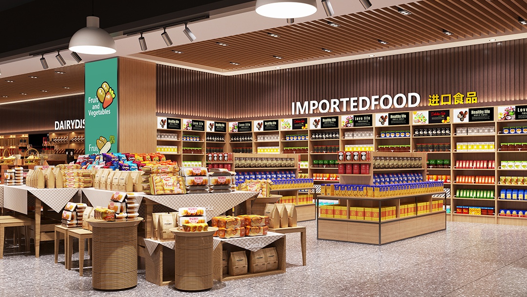 杭州进口食品超市装修设计,踏入店内,一盏盏射灯精准聚焦,柔和而明亮的光线洒在食品上,凸显其精致包装与诱人色泽,仿佛在诉说着来自世界各地的美味故事。裸顶喷黑的设计独具匠心,打破传统天花板的束缚,营造出工业风与现代感交织的独特氛围,让空间更显开阔大气。原木展示货架,错落有致地分布其中,天然的木纹质感,传递着质朴与温暖,为进口食品增添了一份自然的亲和力。咖色元素巧妙点缀,从货架的装饰线条到软装细节,咖色的沉稳优雅与原木的质朴相得益彰,提升了整体的格调。在这里,购物成为一场视觉与味觉体验。