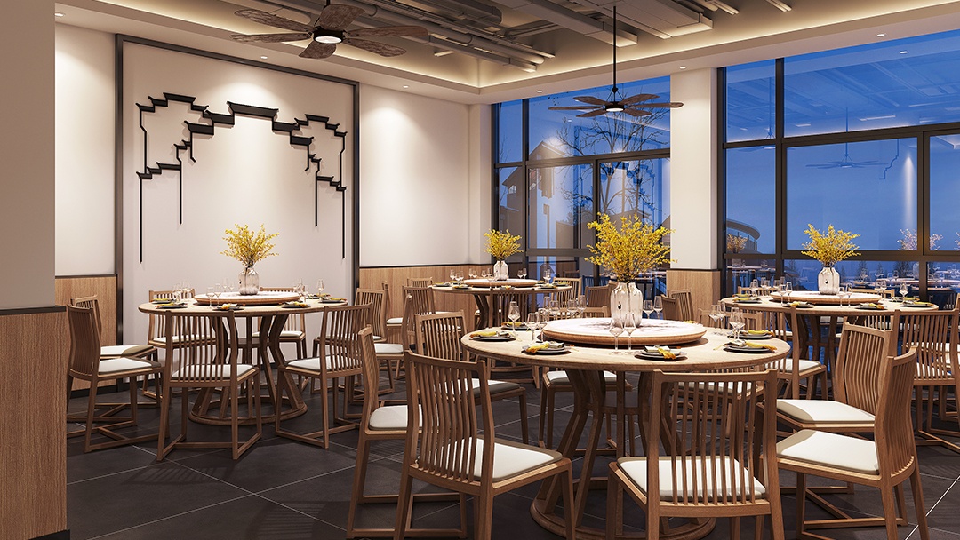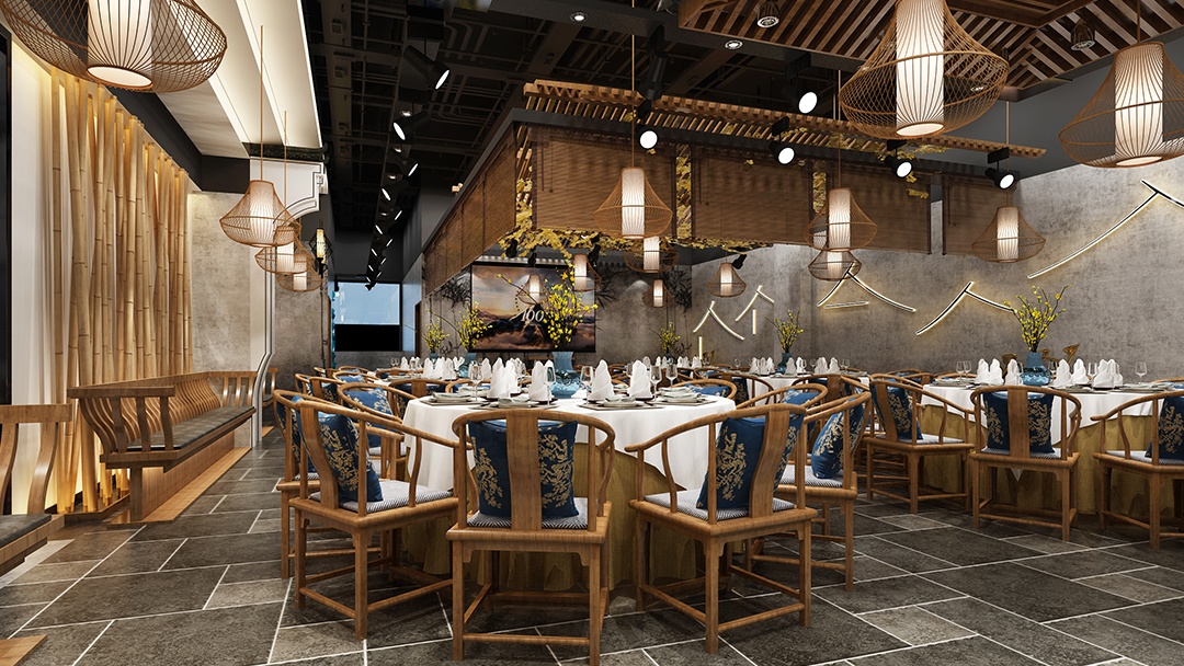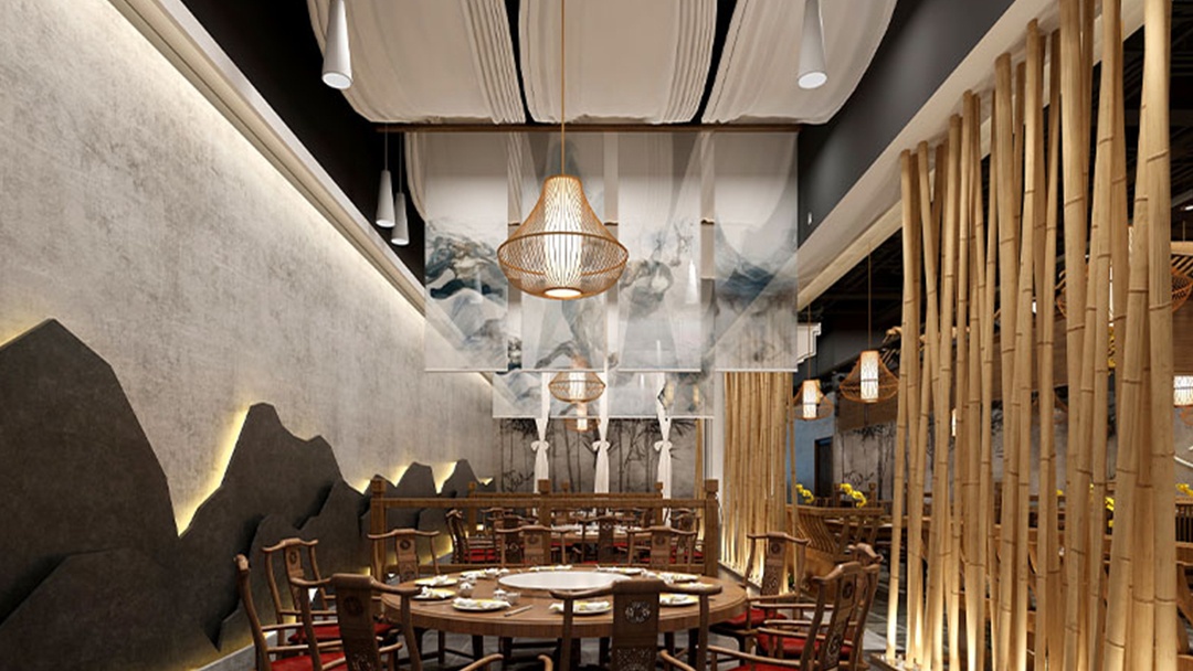 我们根据餐厅所在地域文化,选择具有地域特色的材料。包括青砖、瓦片、竹编、石雕等,来强化地域感。