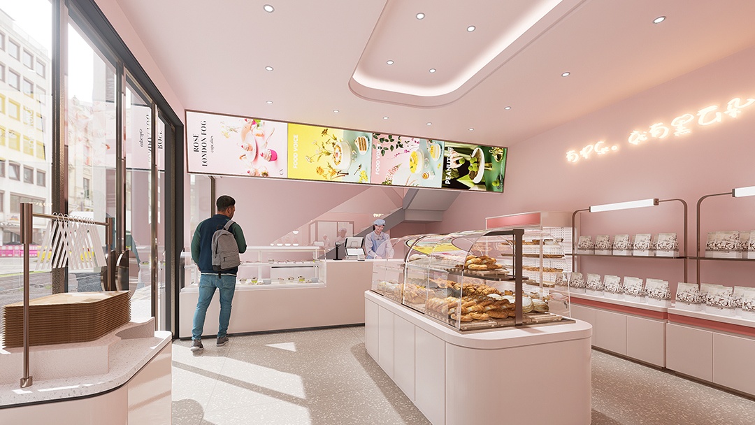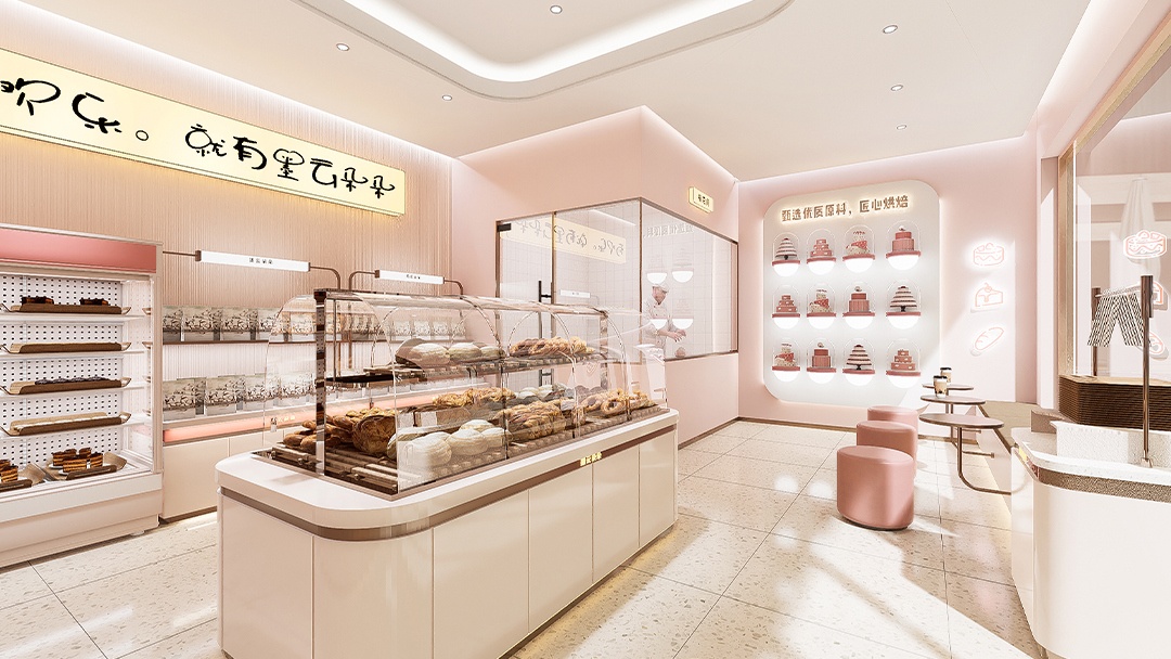 杭州网红烘焙店装修设计亮点,本案以“甜蜜剧场”为概念,打造沉浸式烘焙社交空间。弧形岛台与翻糖艺术装置形成视觉焦点,墙面采用渐变色手工肌理漆,呼应马卡龙主题色彩。临街面设计折叠全景窗,搭配外摆休闲区增强互动感。重点打造“透明后厨长廊”与“自选原料市集”,结合暖调轨道射灯与定制复古面包陈列架,在强化生产可视性与产品新鲜度的同时,构建高传播性的打卡场景,实现功能与美学的双向赋能。