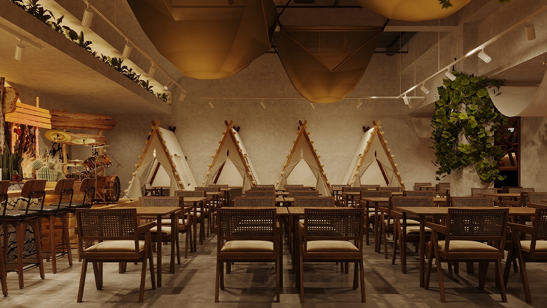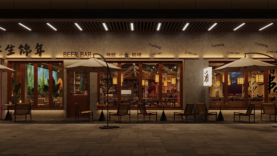 杭州露营风户外酒吧装修设计,本案以“都市旷野聚落”为概念,将山系美学植入城市夜生活。空间铺陈砾石地与仿真草坪,搭配复古煤油灯串与天幕系统。中心区域架设篝火装置与折叠椅环座,吧台由改装露营车箱体构成。墙面运用防锈钢板与回收木料,嵌入户外装备展示架与多功能电源接口。顶部悬挂星空投影网,结合隐藏式取暖设备与驱蚊系统,营造全天候可用的沉浸式户外社交场景。