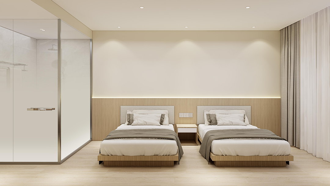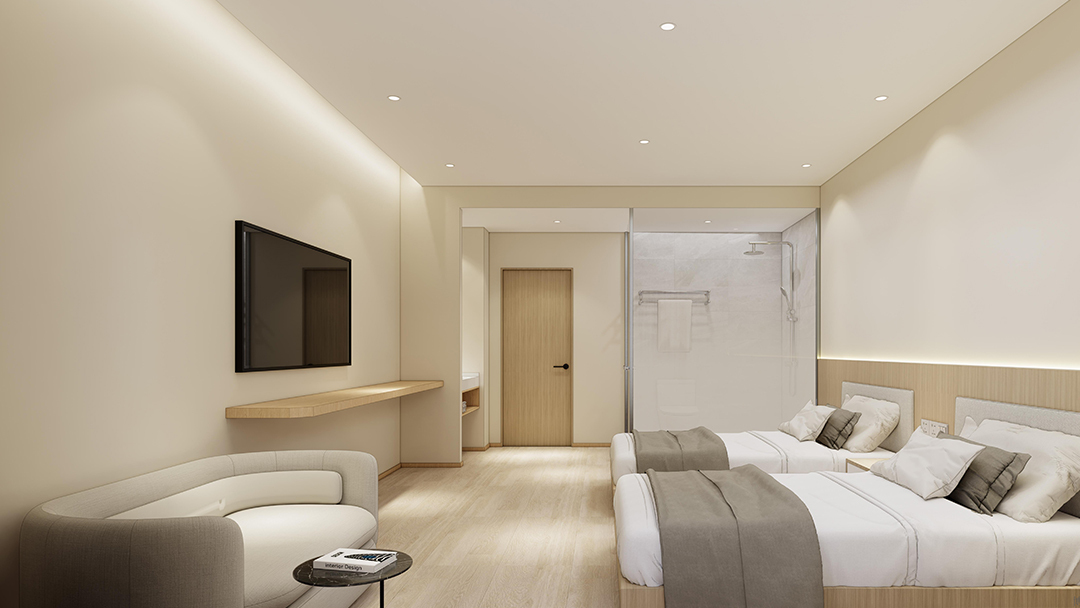 杭州极简风酒店装修设计,以极简与轻工业风为设计核心,采用天然褐色原木与灰色砌砖营造质朴氛围,外立面大面积落地玻璃引入自然光,实现古朴与现代的交融。室内以几何线条分割功能区,如镜面玻璃走廊延伸空间感;客房内暖黄原木与冷灰淋浴玻璃形成视觉对比,顶楼保留裸露木质屋顶,搭配钢结构阁楼提升实用性,尽显极简设计中的精致巧思。