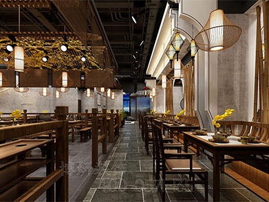 博妍装饰突破传统装修思维,将餐饮空间视为品牌故事的立体化呈现。例如为杭州某川湘菜馆设计的“烟火隐于市”主题空间,通过提取东方建筑中的拱形、柱体元素,结合现代洄游动线,打造出半开放式包间与巨幅落日天幕灯装置。空间中质朴的夯土墙面、纹理感柱体与摩登中古台灯形成冲突美学,既传递“家常菜精致化”的品牌理念,又成为顾客自发传播的社交货币。。