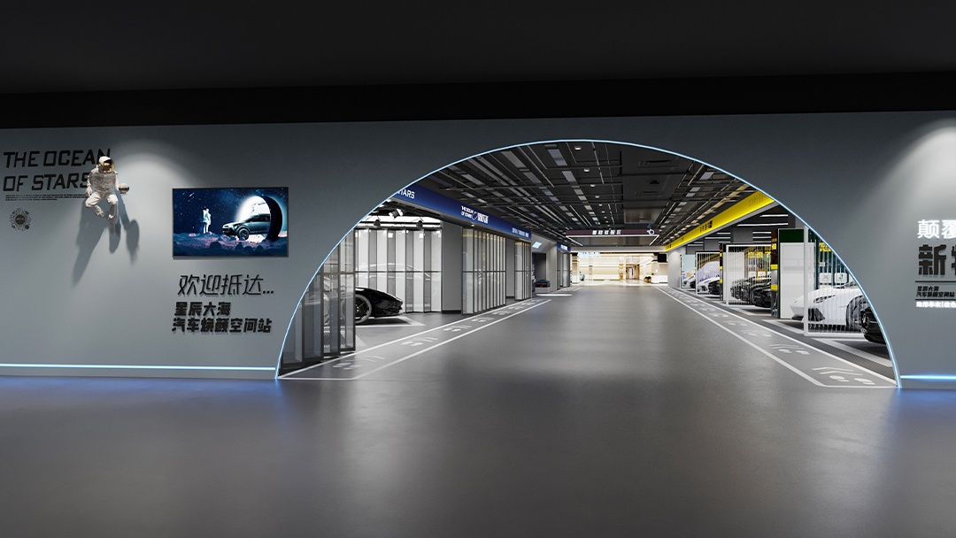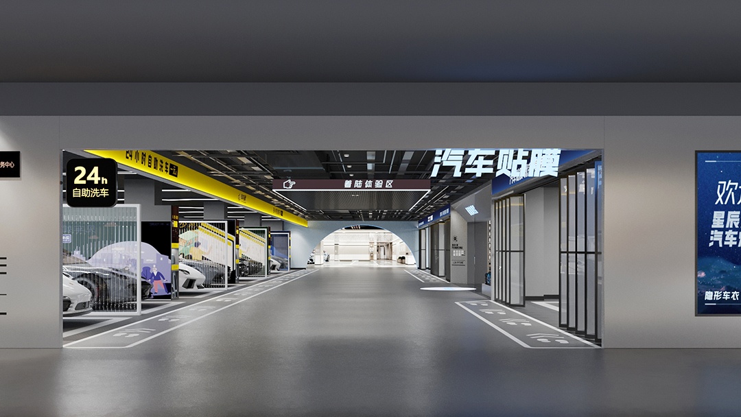 杭州智能汽车美容院装修设计,本案构建全流程智能养护场景。空间采用白色高光纳米涂层墙面与深灰导光地胶,顶部集成无影AI检测光源阵列,可自动识别车身划痕与漆面状态。施工区配备机械臂辅助清洗系统与物联网水质监测终端,客户可通过手机端实时查看护理数据图谱。休息区设置全息投影沙盘,动态演示护理工艺与材料特性,以科技透明化重塑高端汽车美容的服务信任体系。