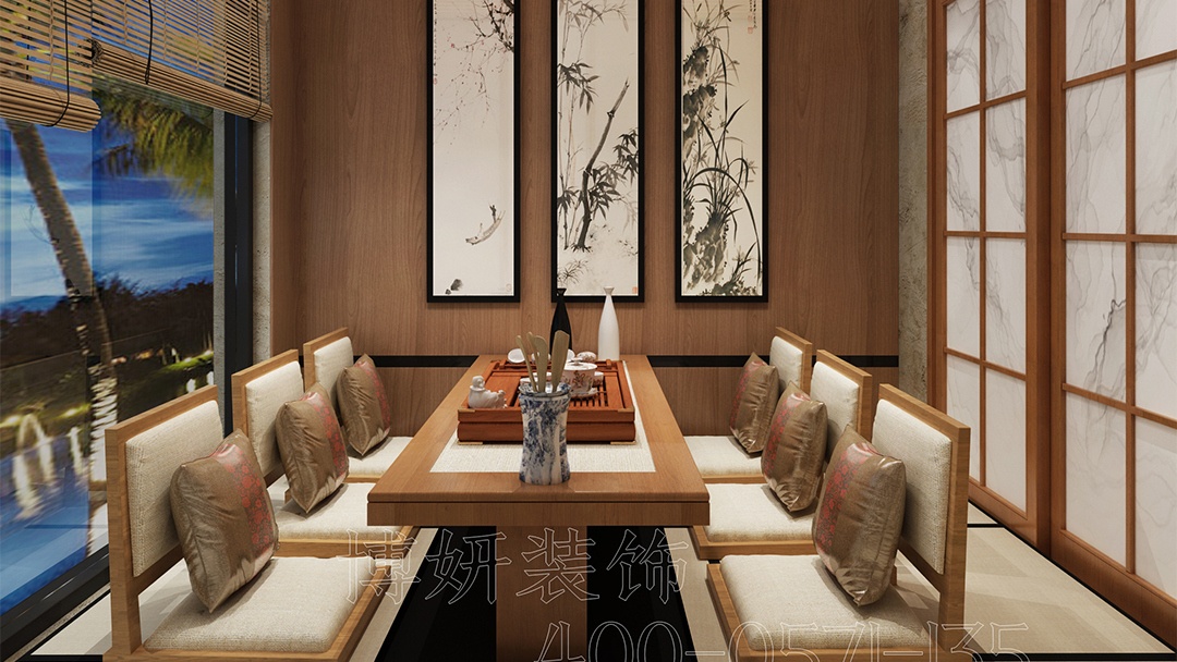 材质与氛围:选用原木、竹编、素色涂料等天然材料,搭配暖黄灯光与庭院枯山水造景,营造静谧雅致的用餐环境。