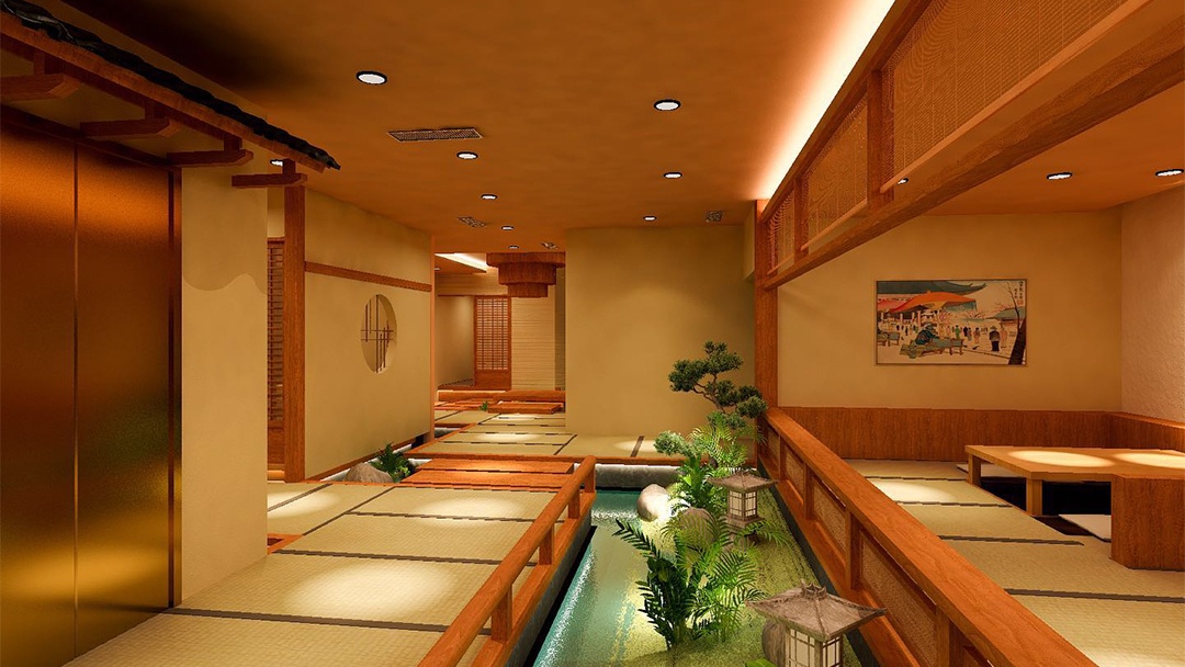 材质与氛围:选用原木、竹编、素色涂料等天然材料,搭配暖黄灯光与庭院枯山水造景,营造静谧雅致的用餐环境。