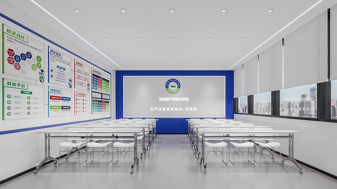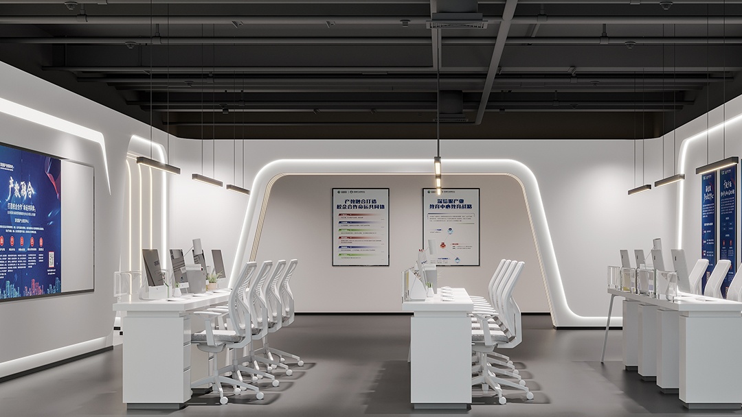 杭州科技展厅装修设计,以简洁白为主色调,开启一场科技与美学的对话。纯净的白色墙面与地面,营造出开阔、明亮,且极具未来感的空间氛围,让参观者仿若置身科技纯净之境。蓝色,作为点缀色巧妙融入,从展示设备的边框到指示标识,蓝色线条与光影交织,为简洁空间注入灵动与科技活力,凸显科技产品的创新与智慧。裸顶喷黑处理,堪称点睛之笔,工业风的粗犷与整体简洁风形成反差又完美融合,专业大气之感扑面而来。搭配精心布局的灯光系统,重点突出展示区域,引导参观者视线。杭州科技展厅,以简洁白蓝与裸顶喷黑的独特设计,打造出一个既具科技专业度,又富有艺术美感的展示空间。