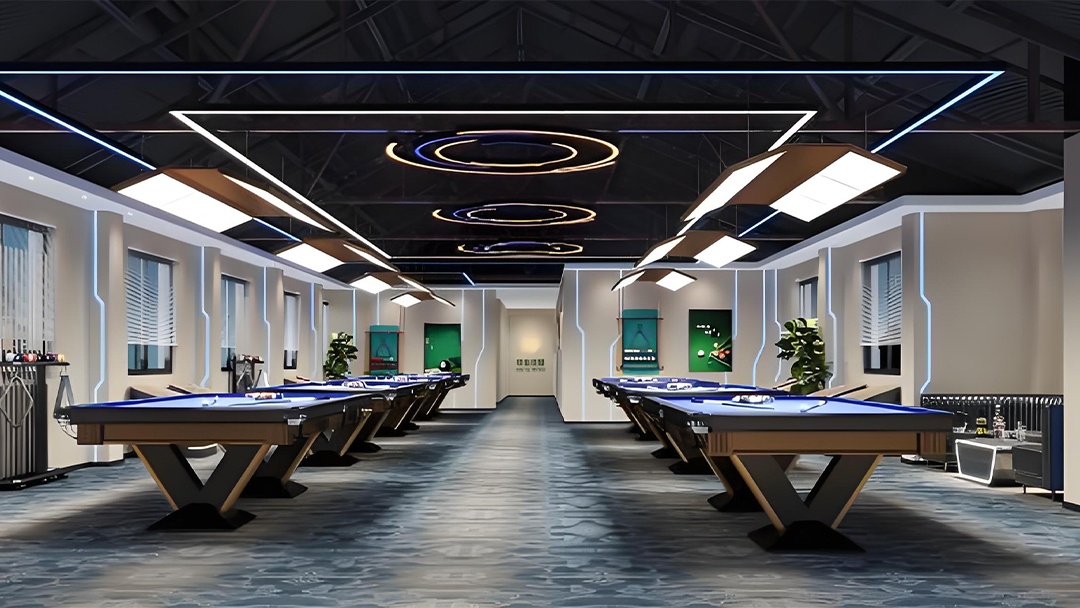 针对台球厅需求,博妍从三大维度构建解决方案:空间布局上,严格遵循行业标准,确保球桌间距1.5米以上、主通道宽度合理,实现比赛区、休息区、水吧等功能分区的科学动线分离;环境营造方面,采用4000K中性光LED无影灯系统,搭配深色吸音墙面与PVC防滑地板,通过声学优化将噪音控制在55分贝以下;增值服务区则整合智能预约系统、自助结算终端及会员管理平台,提升运营效率。