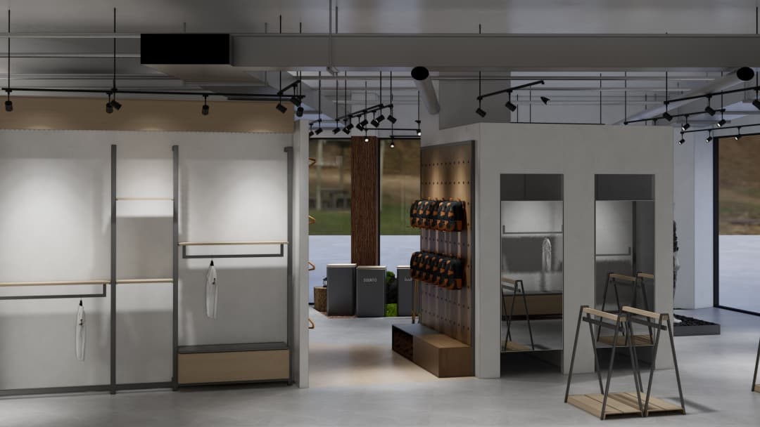 • 功能分区优化:设置动态展示区与静态试衣间,通过高低错落平台划分区域,既保证顾客探索动线的流畅性,又满足装备试用的专业需求;
