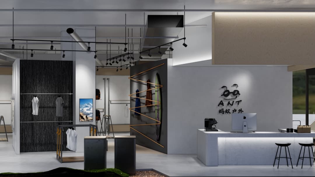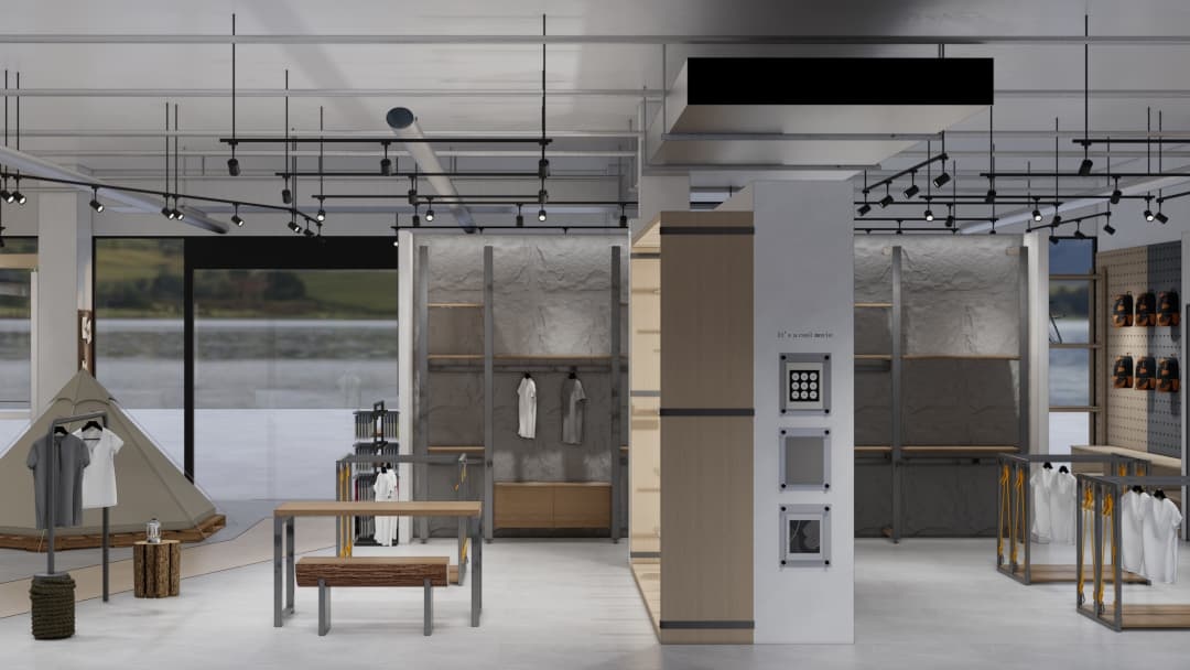 • 沉浸式场景营造:运用岩石纹理、绿植墙及仿木质元素还原自然氛围,搭配可调节色温的射灯模拟不同时段光线,强化产品在登山、徒步等场景中的适配性;