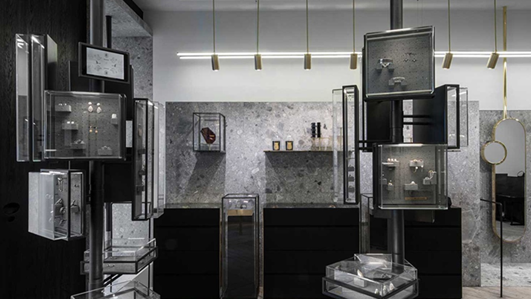 杭州奢侈品珠宝店装修设计,以高级灰为基调,勾勒出无与伦比的奢华意境。