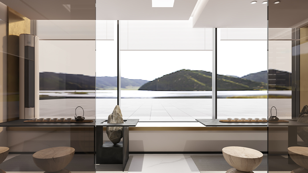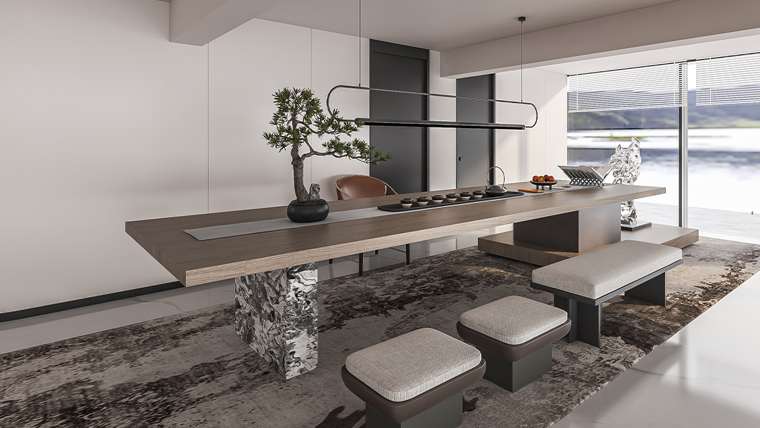 采用无主灯设计结合智能调光系统,通过磁吸轨道灯与隐藏式灯带营造多场景氛围;开放式茶台区以线性照明强化操作台面实用性,私密包厢则利用夹绢玻璃移门实现光线柔和过渡,兼顾社交互动与静谧独处需求。 - 细节处的文化隐喻