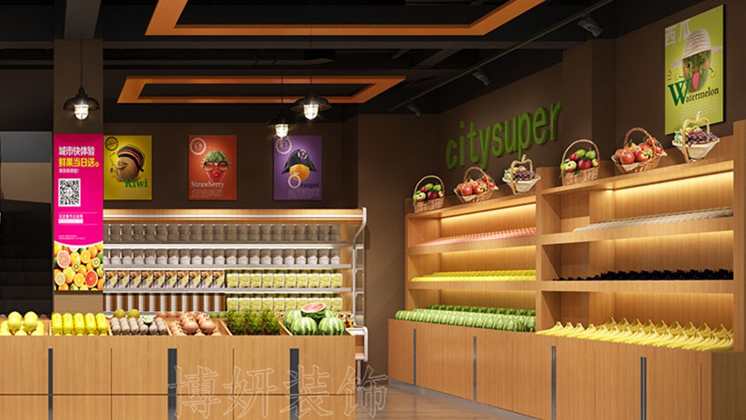 杭州连锁水果超市装修设计,走进店内,裸顶喷黑的处理打破常规,营造出工业风与时尚感交织的独特氛围,让空间更具纵深感与神秘气息。橙黄色作为点缀色惊艳亮相,从招牌到店内的装饰线条,灵动的橙黄如跳跃的音符,瞬间抓住顾客目光,传递出水果的鲜活与热情,激发人们的购买欲望。原木展示货架,是店内一大亮点,天然的木纹质感,给人质朴、温暖的感受。其合理的分区设计,让各类水果有序陈列,方便顾客挑选。橙黄与原木、黑顶相互映衬,既有时尚的冲击力,又不失自然的亲和力。在这里,顾客能尽情享受一场视觉与味觉的双重盛宴。