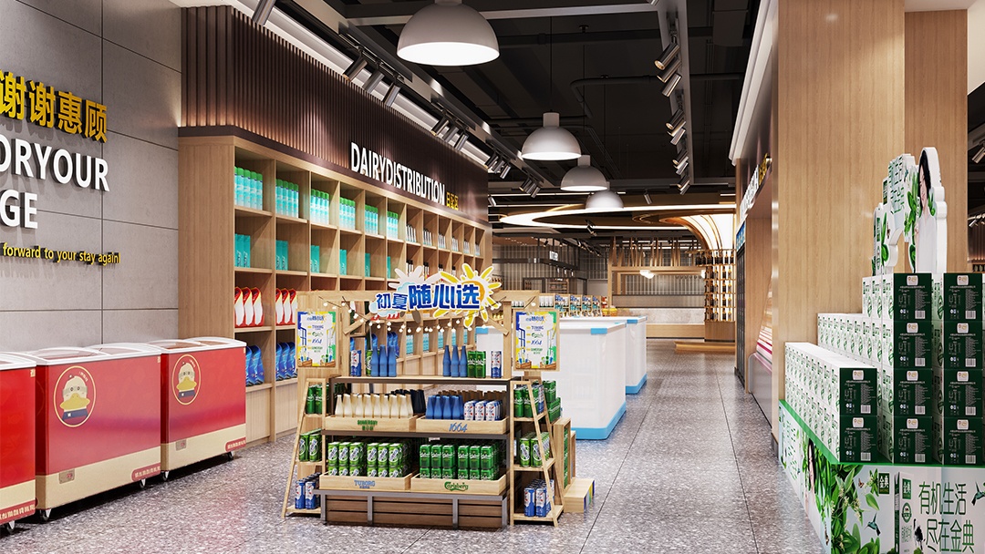杭州进口食品超市装修设计,踏入店内,一盏盏射灯精准聚焦,柔和而明亮的光线洒在食品上,凸显其精致包装与诱人色泽,仿佛在诉说着来自世界各地的美味故事。裸顶喷黑的设计独具匠心,打破传统天花板的束缚,营造出工业风与现代感交织的独特氛围,让空间更显开阔大气。原木展示货架,错落有致地分布其中,天然的木纹质感,传递着质朴与温暖,为进口食品增添了一份自然的亲和力。咖色元素巧妙点缀,从货架的装饰线条到软装细节,咖色的沉稳优雅与原木的质朴相得益彰,提升了整体的格调。在这里,购物成为一场视觉与味觉体验。