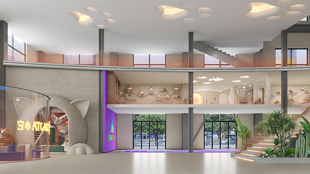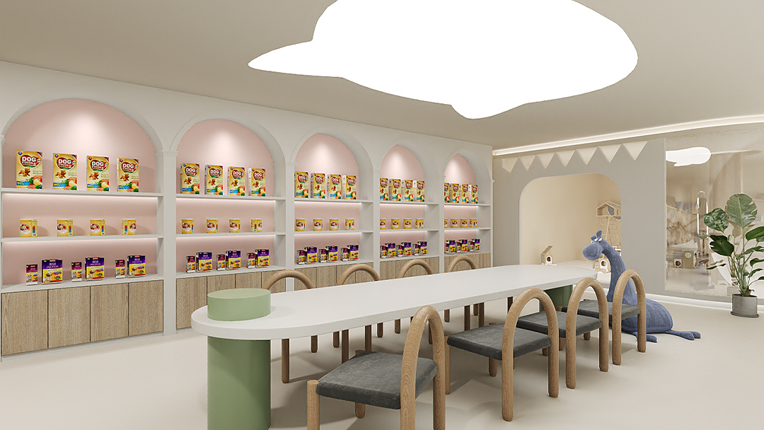 采用“模块化隔断+开放式布局”组合,划分美容区、寄养舱、活体展示区及医疗操作间。例如犬类活动区铺设防滑橡胶地板,猫柜采用双层立体结构并嵌入隐藏式猫砂盆,提升空间利用率的同时减少宠物应激反应。 - 自然元素与治愈氛围