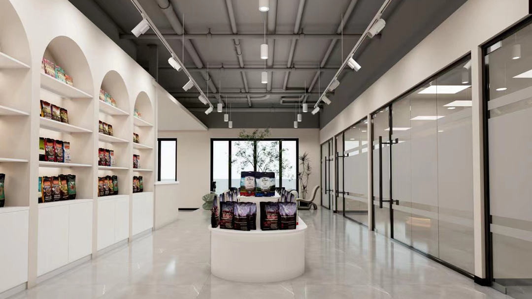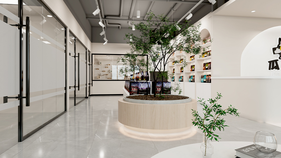 采用可移动隔断与多功能家具系统,灵活划分活体展示区、美容SPA区、寄养舱及零售区。例如,犬类活动区配备智能防撞护栏与自动喂食系统,猫柜集成恒温恒湿新风模块,确保宠物舒适度。 - 环保材质与健康生态