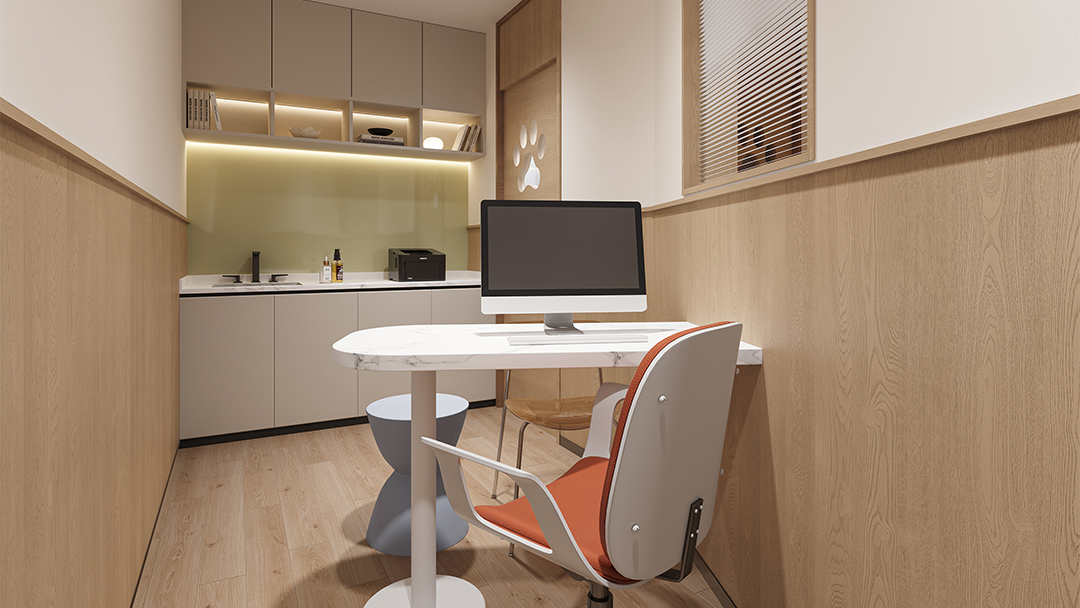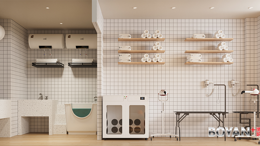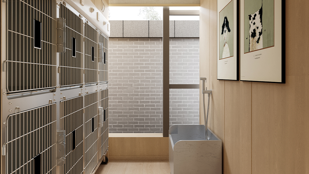 利用层高优势构建双层结构:一层设置活体展示区与美容SPA区,二层规划寄养舱与休闲互动区。例如犬类活动区采用防滑玻璃地板,猫柜则设计成树屋式攀爬架,提升空间利用率。 - 工业风与自然元素融合