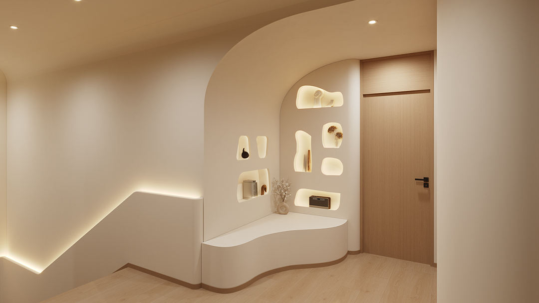 保留原始水泥墙面与金属网格吊顶,搭配原木色生态板及绿植墙,粗犷中透出温馨。 - 智能科技赋能体验