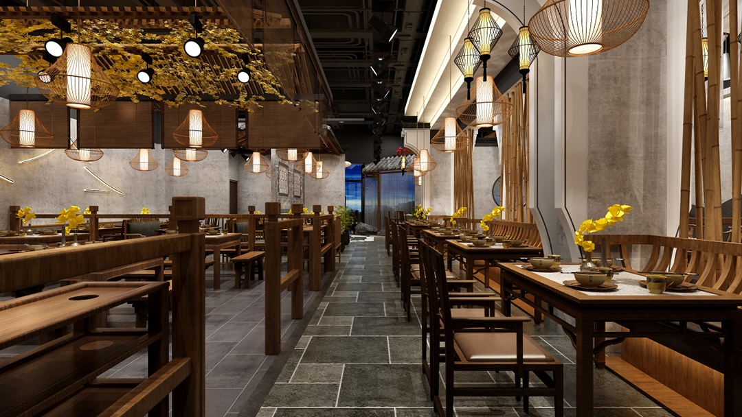 我们根据餐厅所在地域文化,选择具有地域特色的材料。包括青砖、瓦片、竹编、石雕等,来强化地域感。