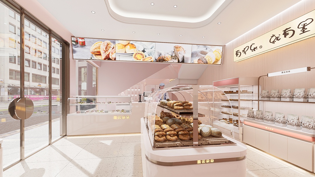 杭州网红烘焙店装修设计亮点,本案以“甜蜜剧场”为概念,打造沉浸式烘焙社交空间。弧形岛台与翻糖艺术装置形成视觉焦点,墙面采用渐变色手工肌理漆,呼应马卡龙主题色彩。临街面设计折叠全景窗,搭配外摆休闲区增强互动感。重点打造“透明后厨长廊”与“自选原料市集”,结合暖调轨道射灯与定制复古面包陈列架,在强化生产可视性与产品新鲜度的同时,构建高传播性的打卡场景,实现功能与美学的双向赋能。