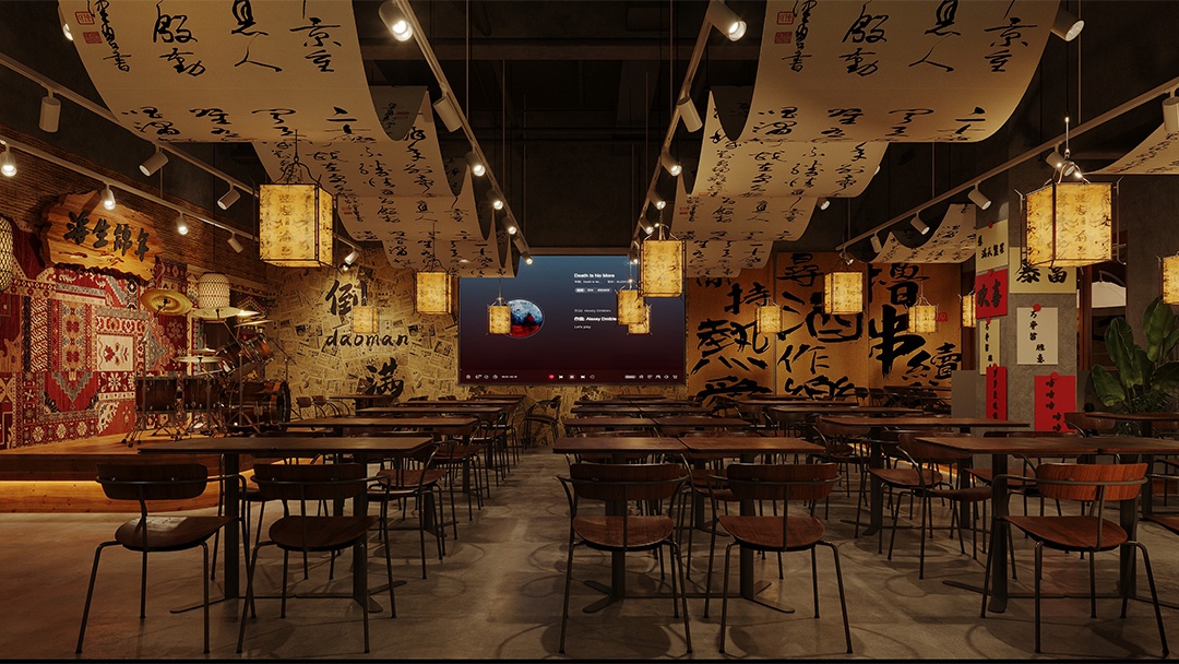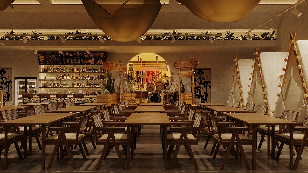 杭州露营风户外酒吧装修设计,本案以“都市旷野聚落”为概念,将山系美学植入城市夜生活。空间铺陈砾石地与仿真草坪,搭配复古煤油灯串与天幕系统。中心区域架设篝火装置与折叠椅环座,吧台由改装露营车箱体构成。墙面运用防锈钢板与回收木料,嵌入户外装备展示架与多功能电源接口。顶部悬挂星空投影网,结合隐藏式取暖设备与驱蚊系统,营造全天候可用的沉浸式户外社交场景。