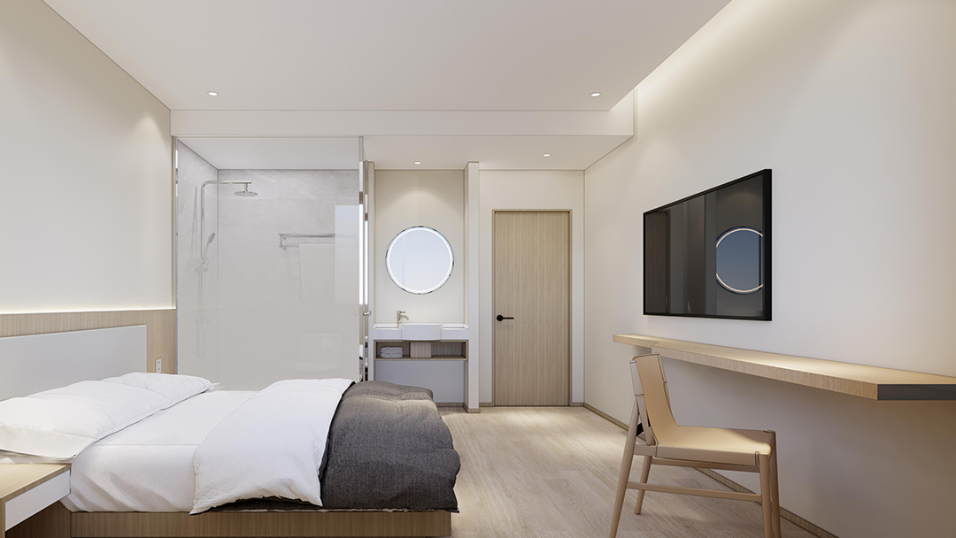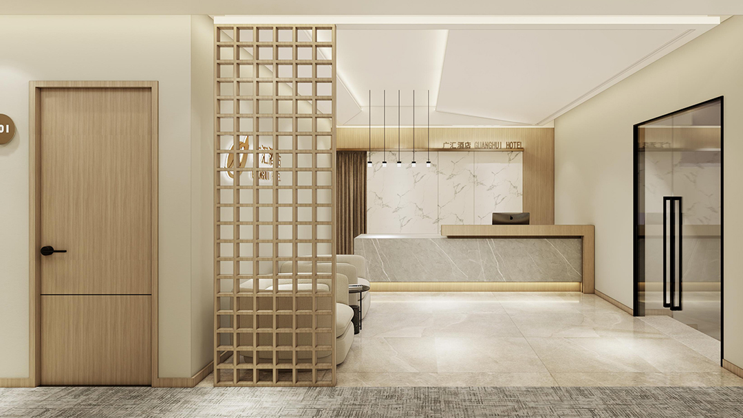 杭州极简风酒店装修设计,以极简与轻工业风为设计核心,采用天然褐色原木与灰色砌砖营造质朴氛围,外立面大面积落地玻璃引入自然光,实现古朴与现代的交融。室内以几何线条分割功能区,如镜面玻璃走廊延伸空间感;客房内暖黄原木与冷灰淋浴玻璃形成视觉对比,顶楼保留裸露木质屋顶,搭配钢结构阁楼提升实用性,尽显极简设计中的精致巧思。
