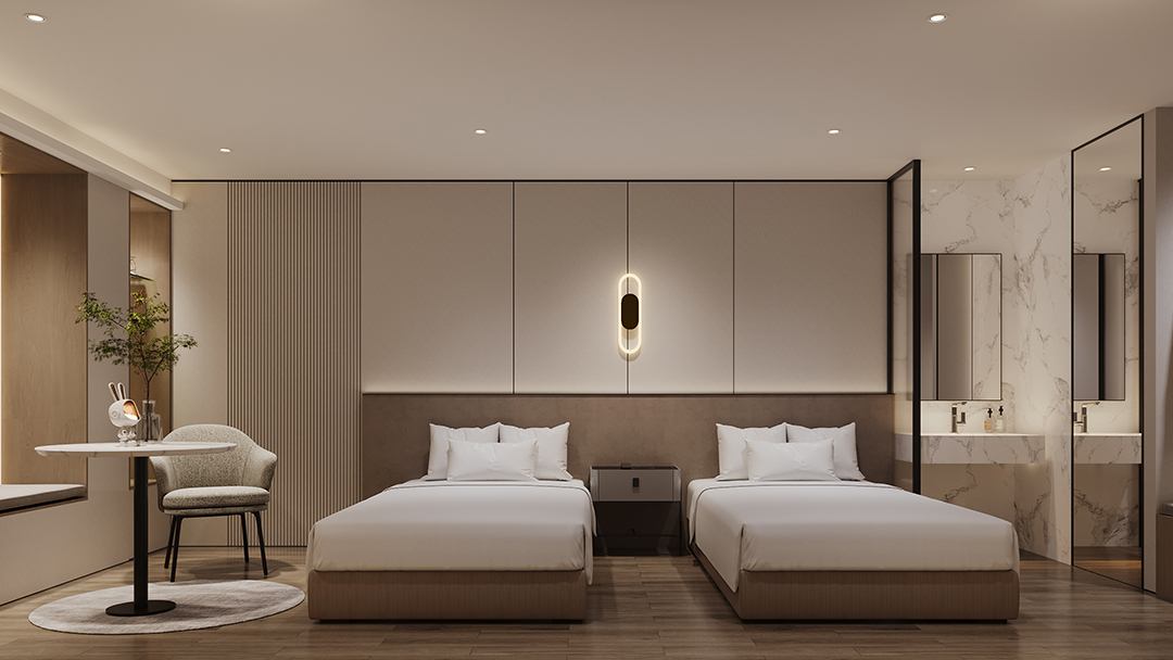 杭州商务会议酒店设计装修,本案以“高效赋能·优雅会议”为核心,将智能科技与东方商务美学深度结合。会议厅采用模块化隔断系统,支持多场景灵活切换,并嵌入全息投影与同声传译设备;墙面选用吸音波纹板材,确保声场纯净。公共空间以浅木纹与深灰石材铺陈,打造静谧休憩走廊。重点设计“云端董事会议室”——270°环幕视野搭配智能会议记录系统,实现高效决策与杭州城市意象的视觉融合,重塑高端商务体验新标准。