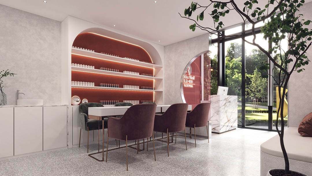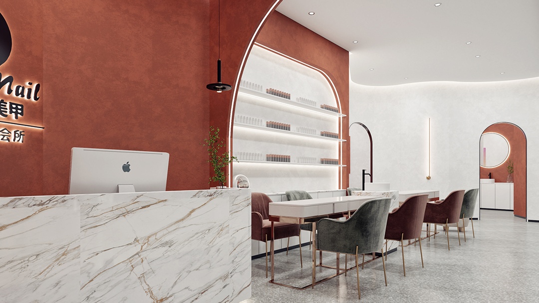 杭州韩系美甲店装修设计,以炽烈红韵,勾勒精致美学空间;打破常规,诠释热情与优雅的碰撞美学。设计,以“炽烈与精致”为核心,选用深红、酒红等层次丰富的红色系墙面,搭配金属线条勾勒轮廓,营造出高级感与视觉张力并存的氛围,瞬间抓住顾客目光。空间焦点,落于定制大理石台面——洁白底色上流淌着天然灰纹,冷冽质感与红色背景形成鲜明对比,既凸显美甲操作的精致感,又便于清洁维护。开放式美甲区,以红色高脚椅搭配智能补光镜,满足社交分享需求;私密包间,则通过红色绒帘与暖光灯带,打造沉浸式变美体验。细节处融入韩式简约装饰,如几何造型摆件、抽象艺术画,让空间在热烈中不失格调,成为杭州美甲界的潮流新地标。