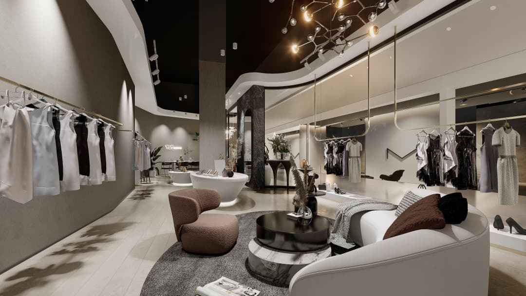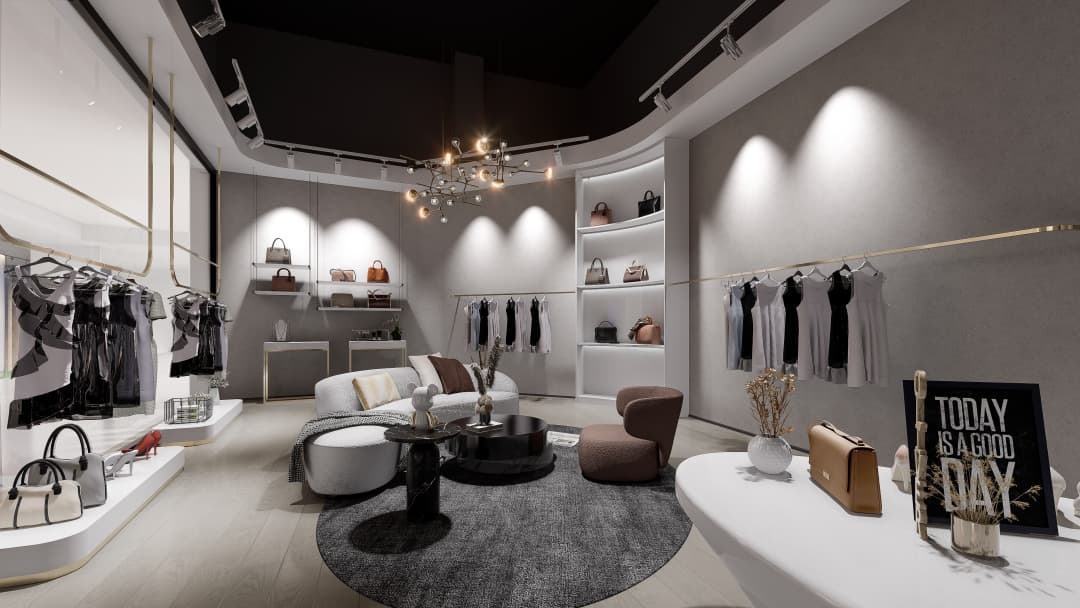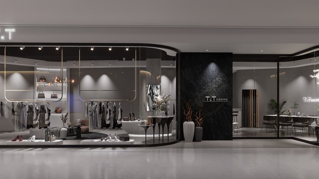 采用高显色照明系统突显服装质感,搭配模块化展架灵活调整陈列;私密试衣区配备智能梳妆镜与人性化挂衣区,兼顾功能性与舒适度。