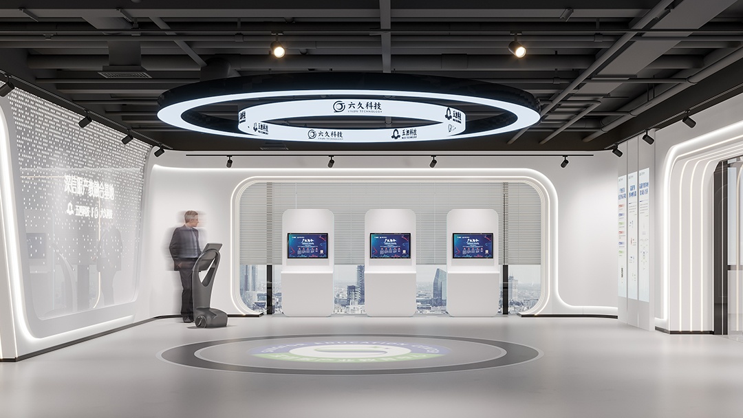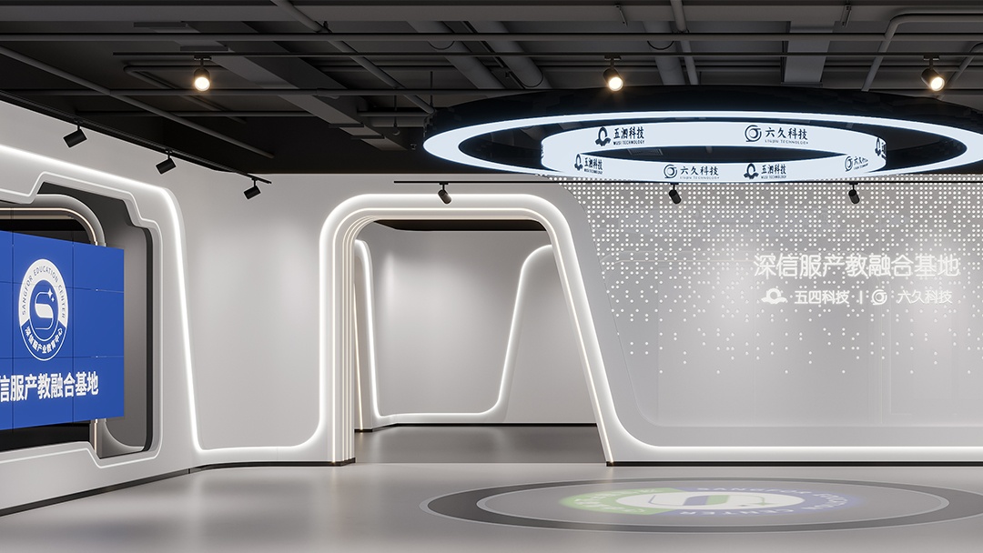 杭州科技展厅装修设计,以简洁白为主色调,开启一场科技与美学的对话。纯净的白色墙面与地面,营造出开阔、明亮,且极具未来感的空间氛围,让参观者仿若置身科技纯净之境。蓝色,作为点缀色巧妙融入,从展示设备的边框到指示标识,蓝色线条与光影交织,为简洁空间注入灵动与科技活力,凸显科技产品的创新与智慧。裸顶喷黑处理,堪称点睛之笔,工业风的粗犷与整体简洁风形成反差又完美融合,专业大气之感扑面而来。搭配精心布局的灯光系统,重点突出展示区域,引导参观者视线。杭州科技展厅,以简洁白蓝与裸顶喷黑的独特设计,打造出一个既具科技专业度,又富有艺术美感的展示空间。