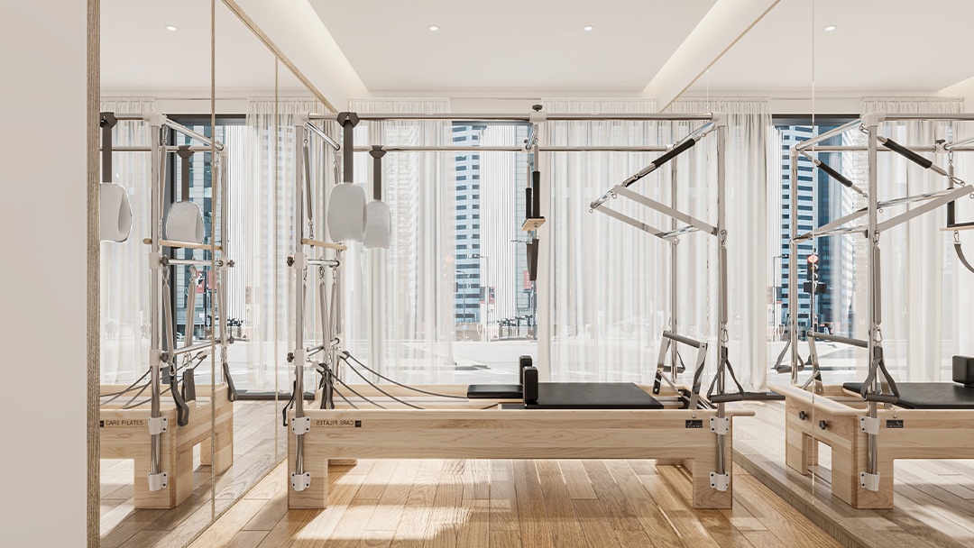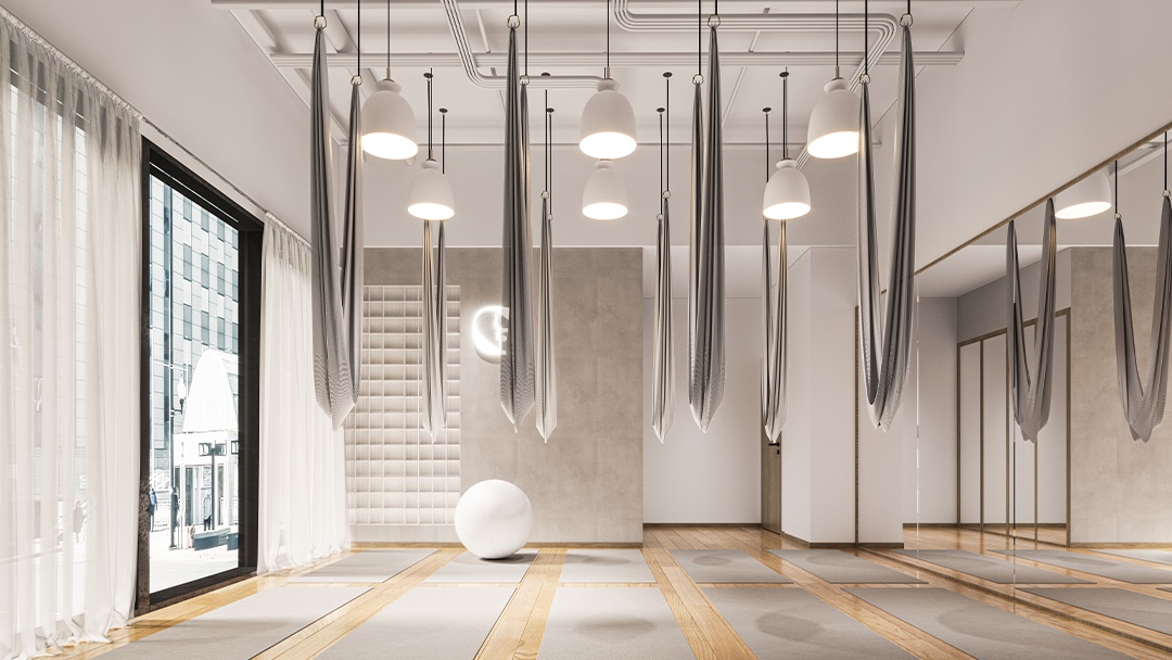 杭州瑜伽普拉提馆装修设计,本案以「流动的平衡」为设计理念,空间采用柔弧曲面墙与橡木地板结合,营造温暖包容的氛围。定制可调节天窗系统,精准控制自然光入射角度,配合隐藏式声学穹顶优化听觉体验。核心区设置悬浮式普拉提重组器械墙,实现空间多功能转换。冥想区墙面嵌入热感壁画,接触时显现植物脉络光影。整体以低饱和色彩为基调,打造身心合一的沉浸式疗愈场域。