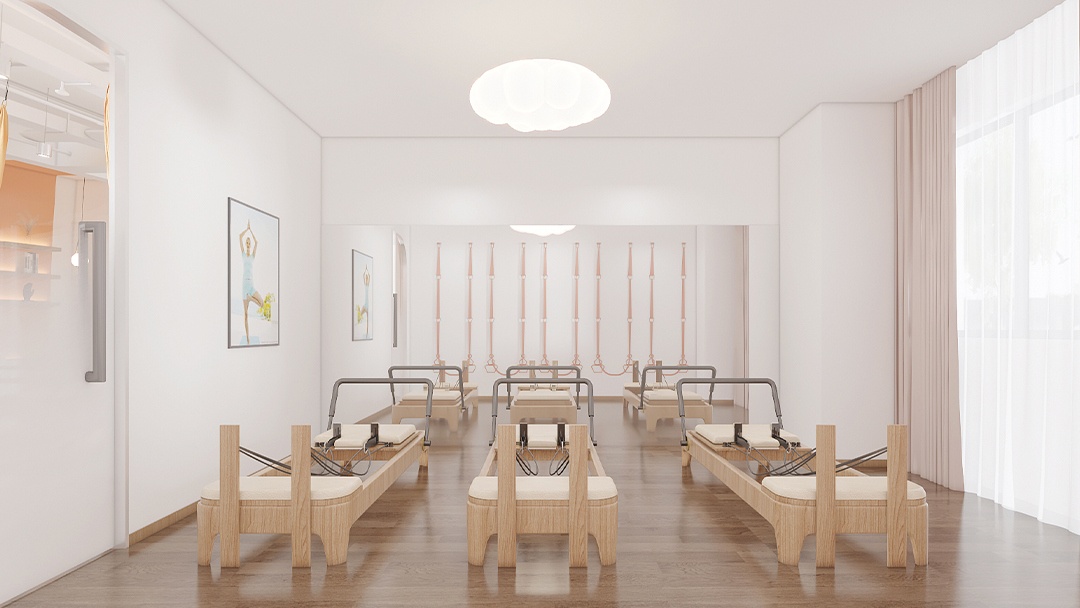 杭州瑜伽馆+健身房融合空间装修设计,本案以「动静平衡哲学」为核心理念,通过光影材质划分动静双区。瑜伽区采用弧形地台与透光软膜天花,营造冥想氛围;健身区配置模块化智能器械与心率投影墙,强化科技感。过渡带设置「能量回廊」——可变色玻璃隔断随课程需求切换通透度,兼作共享休憩吧台。声学系统分区独立调控,空气循环实现干湿区分离。整体以自然肌理与金属细节融合,满足身心双重训练的场景无缝转换。