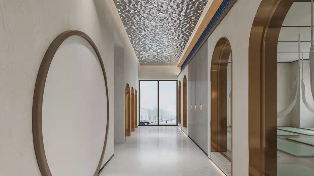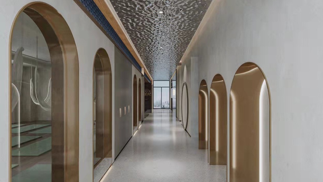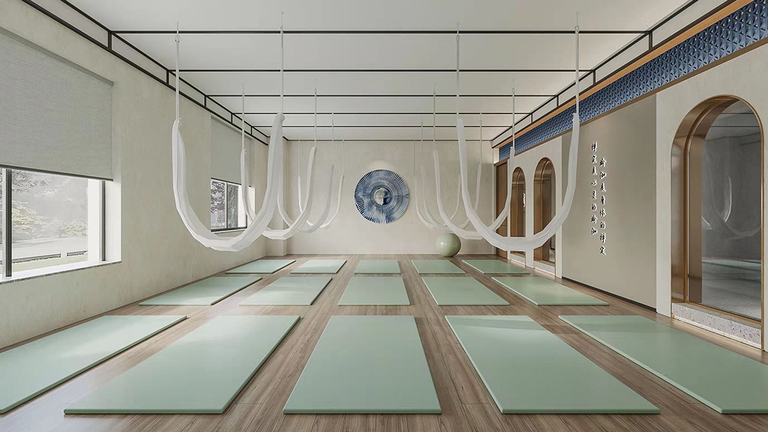 杭州瑜伽馆装修设计,本案以「城市冥想绿洲」为定位,将自然元素与静谧美学深度融合。空间以浅原木与麻编材质构筑,弧形墙面嵌入镂空竹格屏风,光影随时间流转而变幻。地面采用地暖复合地板,顶部悬挂仿藤编吊灯,营造温暖包裹感。重点打造「声景冥想区」——定制穹顶声学结构结合隐藏式环绕音响,可模拟雨声、鸟鸣等自然白噪音。临窗设置悬空茶歇台,远眺城市景观与室内绿植墙相映,实现身心与自然的双向联结。