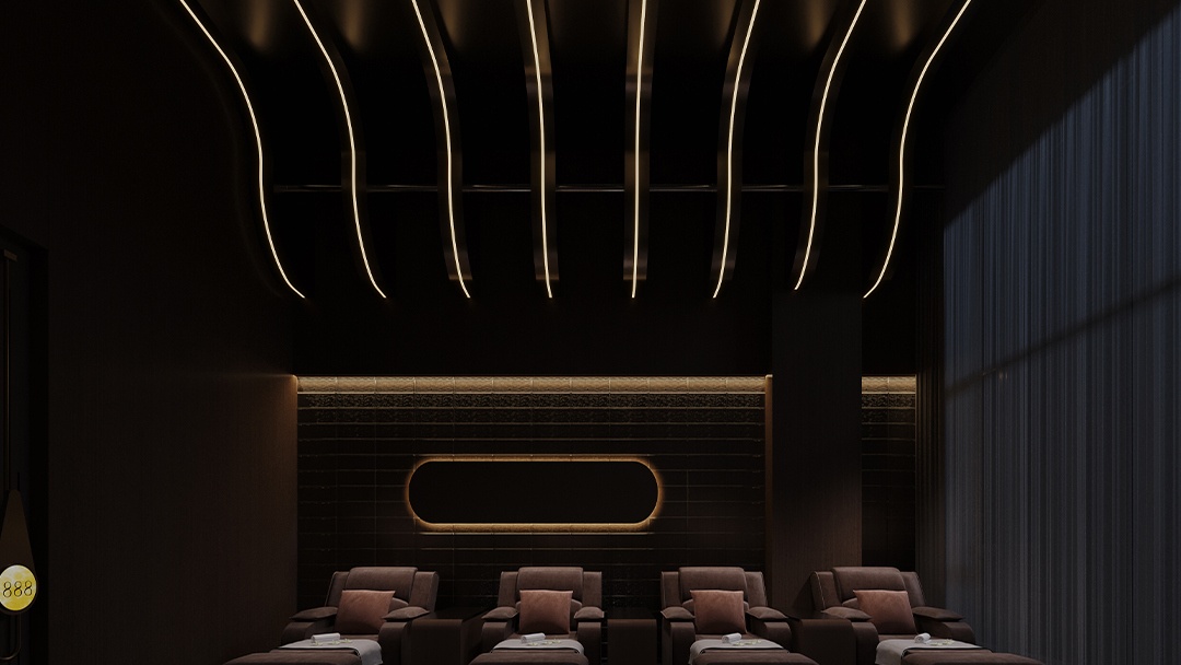 杭州日式汤泉风足浴会所装修设计,本案打造沉浸式日式汤泉体验。入口以枯山水与竹篱甬道引导,内部采用桧木通铺与浅色障子门划分空间。足浴区设下沉式岩盘座席,底部嵌入智能温控足汤池,墙面点缀浮世绘艺术玻璃。雾化玻璃顶棚模拟天光变化,搭配竹筒滴水音效与桧木香氛,融合足部反射疗法与温泉矿物理疗概念,在都市中重构京都汤宿的治愈仪式感。