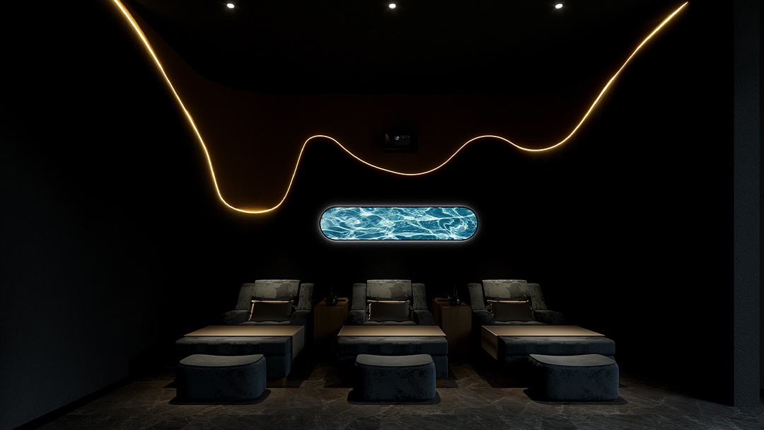 杭州养生禅意足浴店装修设计,本案以“空谷回音”为禅修意境,打造都市中的静心疗愈场域。地面铺设温润老船木地板,点缀枯山水微景观。足疗区设蒲团式下沉座位,顶部悬挂手工纸灯笼,光线柔和如月晕。墙面嵌入隐形音响系统,循环播放溪流、竹林自然白噪音。弧形穹顶内设呼吸引导光影装置,结合艾草香薰与地暖温石疗法,在极致简约中引领身心归静。