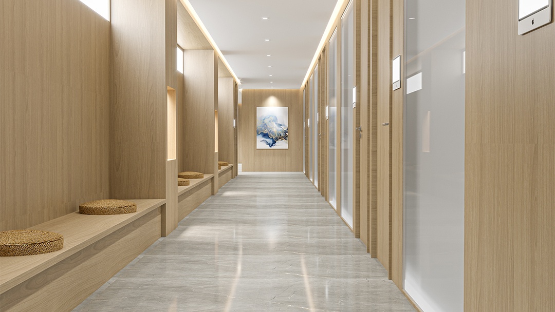 杭州宋韵文化中医馆装修设计,深度还原宋代美学中的简净与意境。空间结构取法宋式建筑的开阖韵律,采用原木榫卯框架与纸筋灰墙面,营造温润基底。药柜区以青瓷色釉面砖为背板,搭配竹编药屉与铜制称量器具。整体以低饱和度色彩与自然光影,重构当代语境下的宋式医药空间体验。